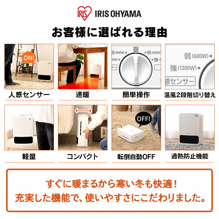 ●商品サイズ(cm)幅約24×奥行約13.2×高さ約34.1●材質ABS樹脂、スチール●電源電圧AC100V●電源周波数50/60Hz●消費電力50Hz:1200W、60Hz:1100W●温風切替2段階(強/弱)●人感センサー検知範囲上下方向:約60°左右方向:約90° ●人感センサー検知距離約1.5m〜2m●コードの長さ約1.8m●質量約2.3kg●暖房の適用床面積(目安)・電源周波数50Hz/断熱材の厚みなし木造住宅:約3畳 (4.9平方メートル) まで、コンクリート住宅:約4.5畳 (6.9平方メートル) まで・電源周波数50Hz/断熱材の厚み50mm木造住宅:約6畳 (8.6平方メートル) まで、コンクリート住宅:約8畳 (12.9平方メートル) まで・電源周波数60Hz/断熱材の厚みなし木造住宅:約3畳 (4.5平方メートル) まで、コンクリート住宅:約4畳 (6.3平方メートル) まで・電源周波数60Hz/断熱材の厚み50mm木造住宅:約5畳 (7.9平方メートル) まで、コンクリート住宅:約8畳 (11.8平方メートル) まで※暖房の目安は、一般社団法人日本電機工業会の統一基準に準拠しています。